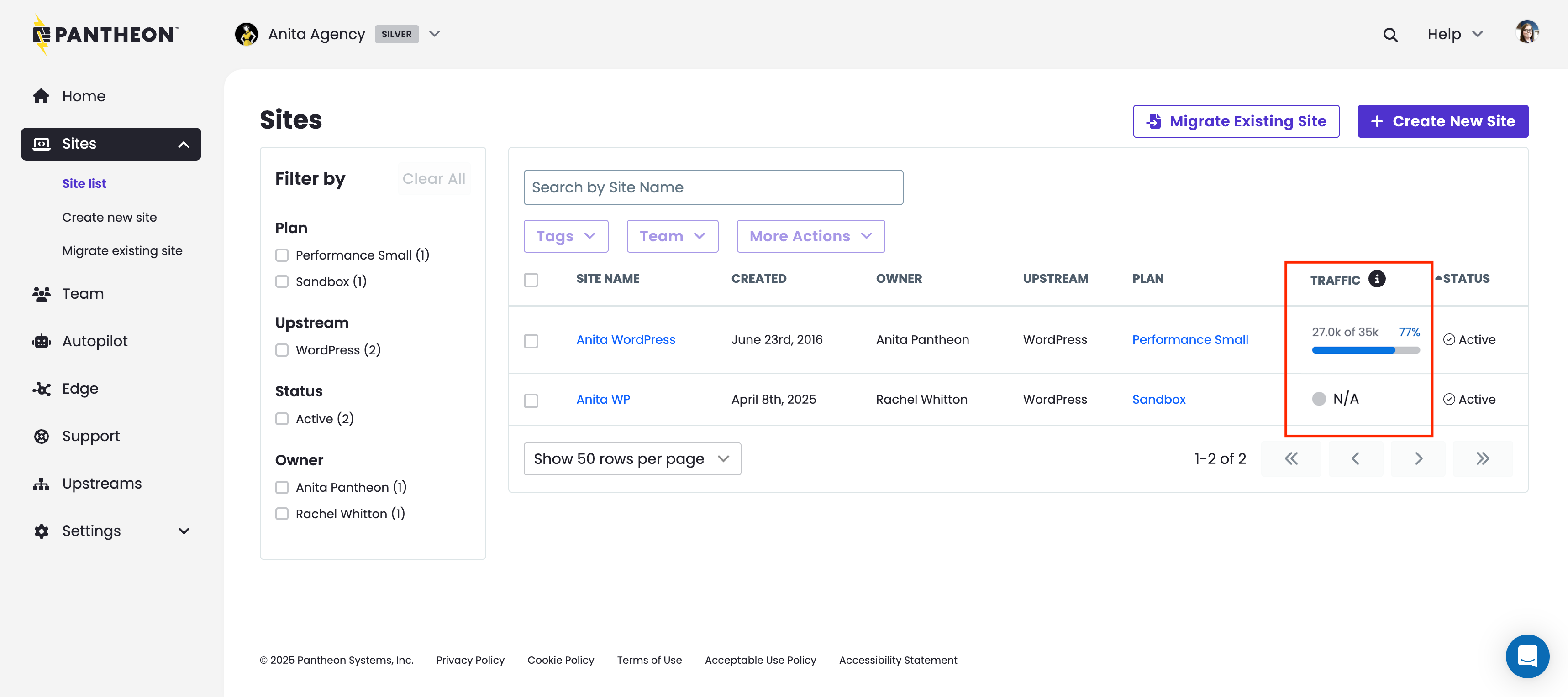 The workspace site list provides a traffic column for high-level usage visibility across all sites, showing data for the Site Visits traffic metric. This data resets at the end of your billing cycle.