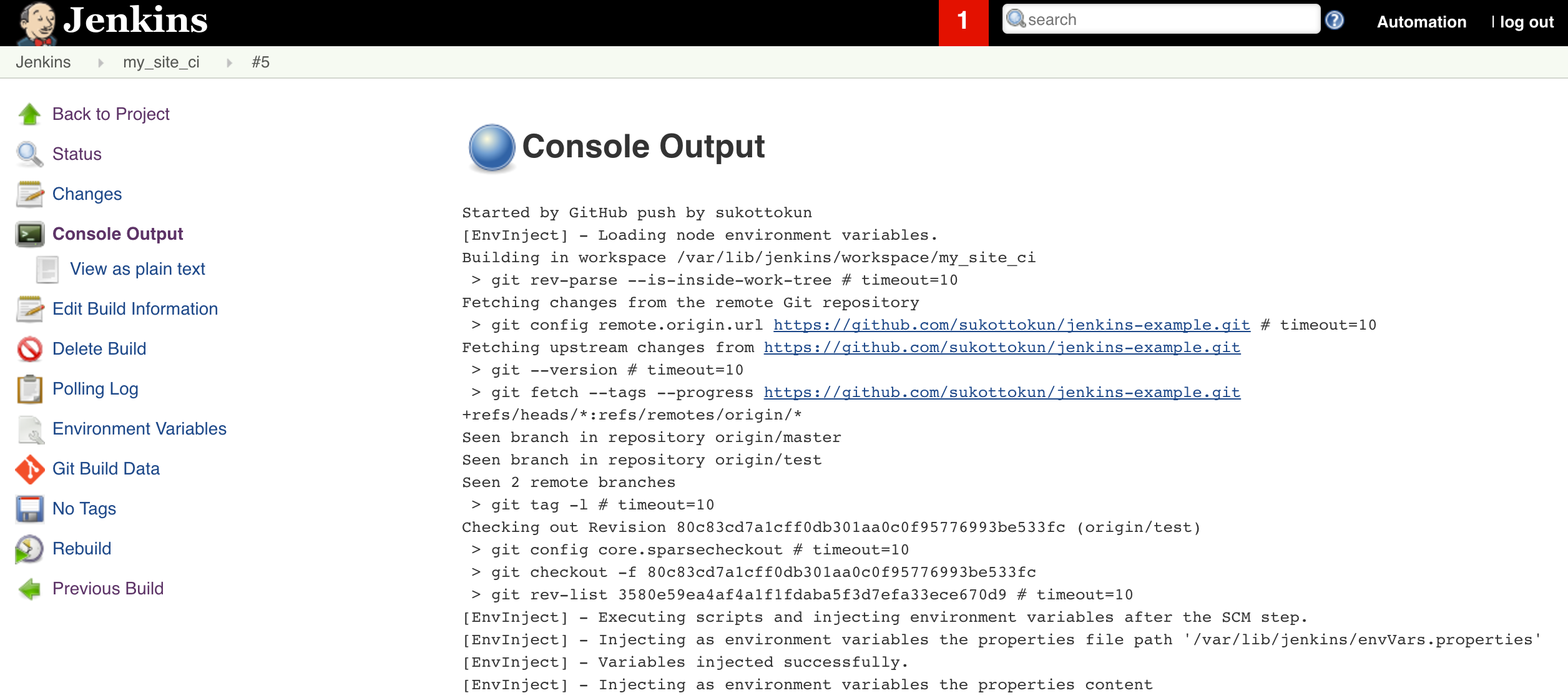 Commit and push to GitHub to initiate a build. You should see the results of the test, which link to the Jenkins job: