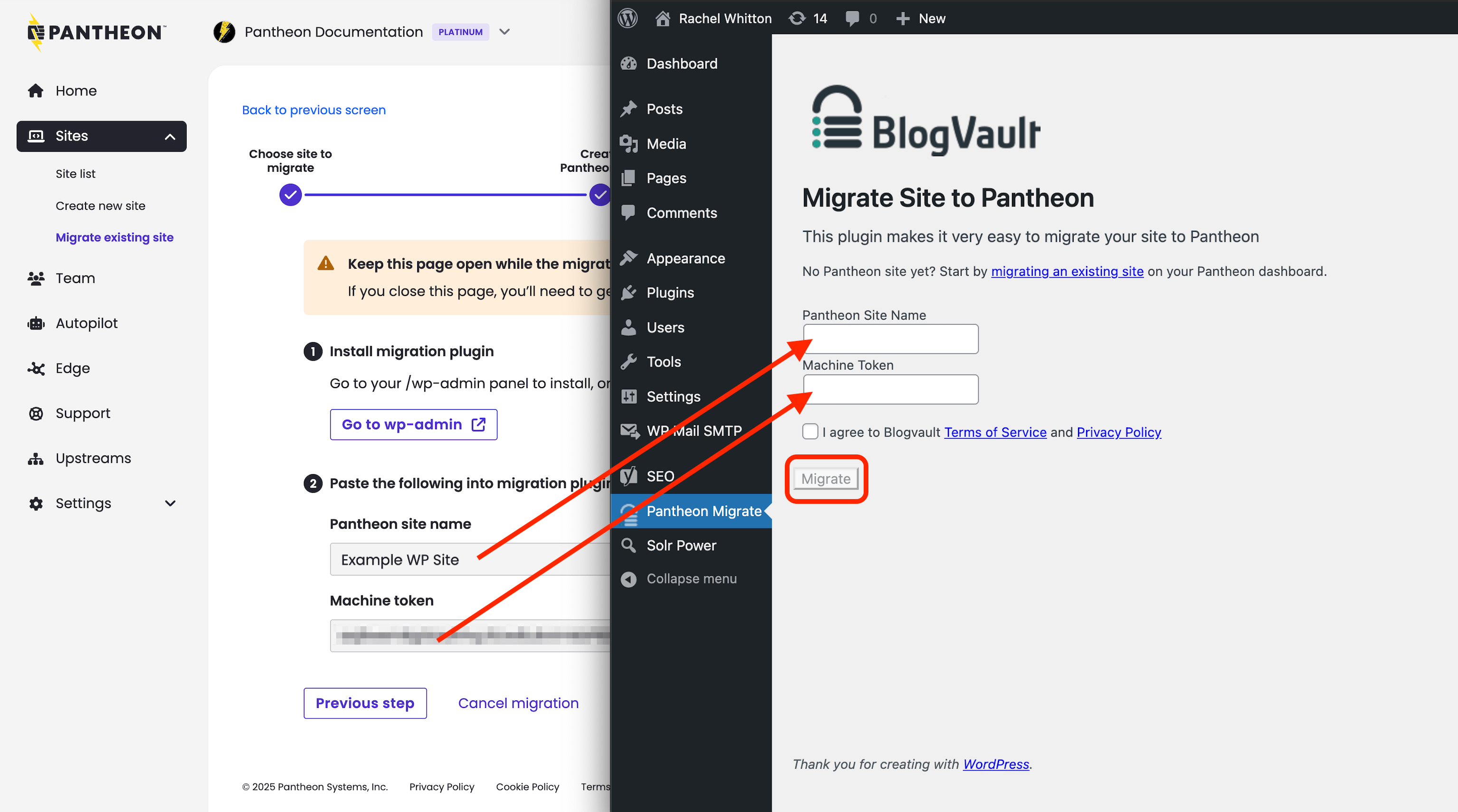 Copy and paste your machine token and site name from the Pantheon Site Dashboard into the plugin form: