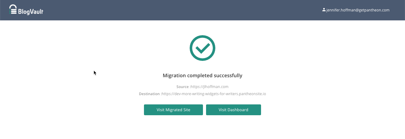 You will see a new page where BlogVault validates the information provided (site name and token), then updates once the migration is in progress and updates once again when completed. You'll also receive an email upon migration completion.