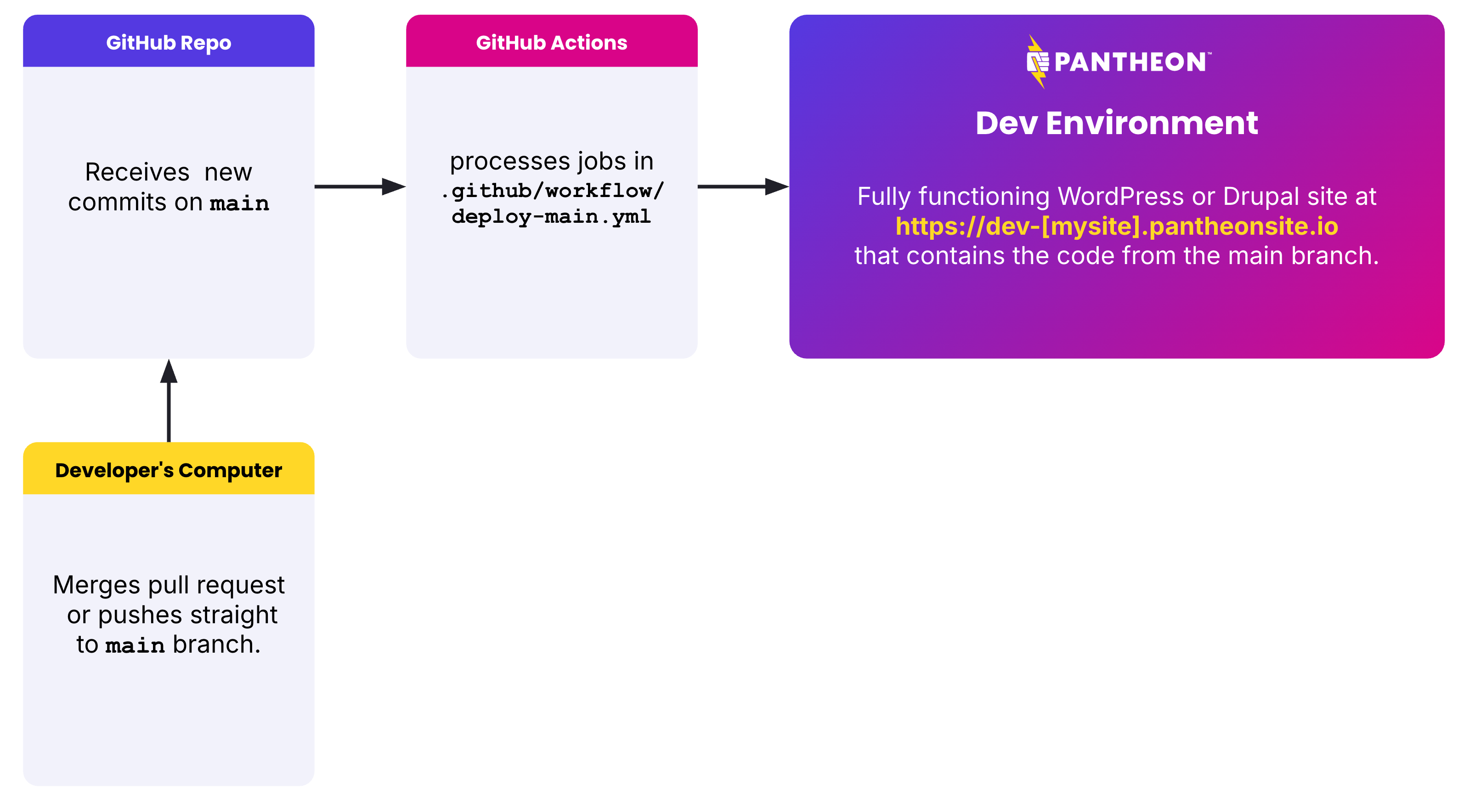The Action can push code to the Pantheon Dev environment upon pull request merges (or direct pushes to a main branch).